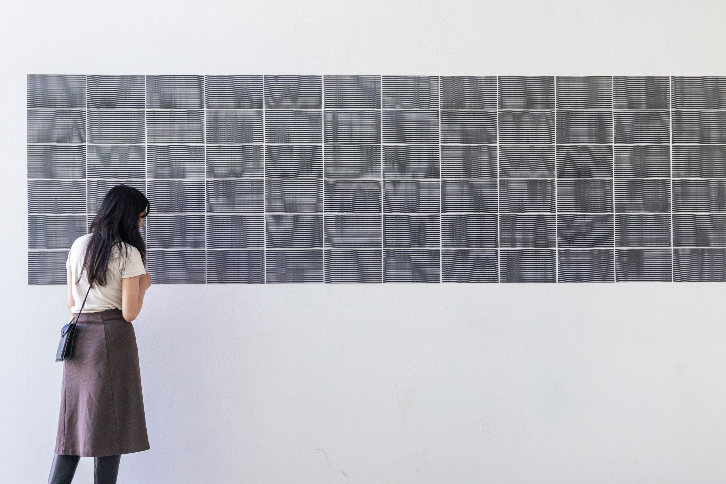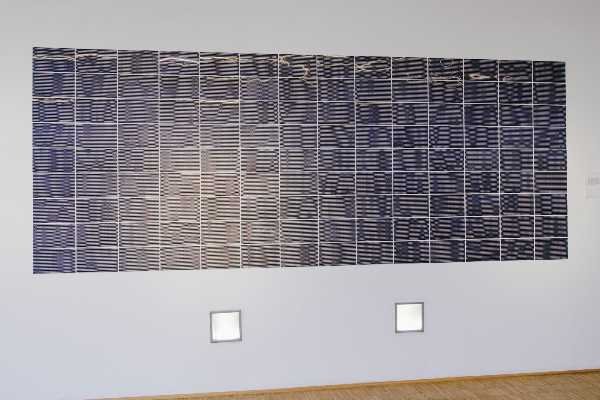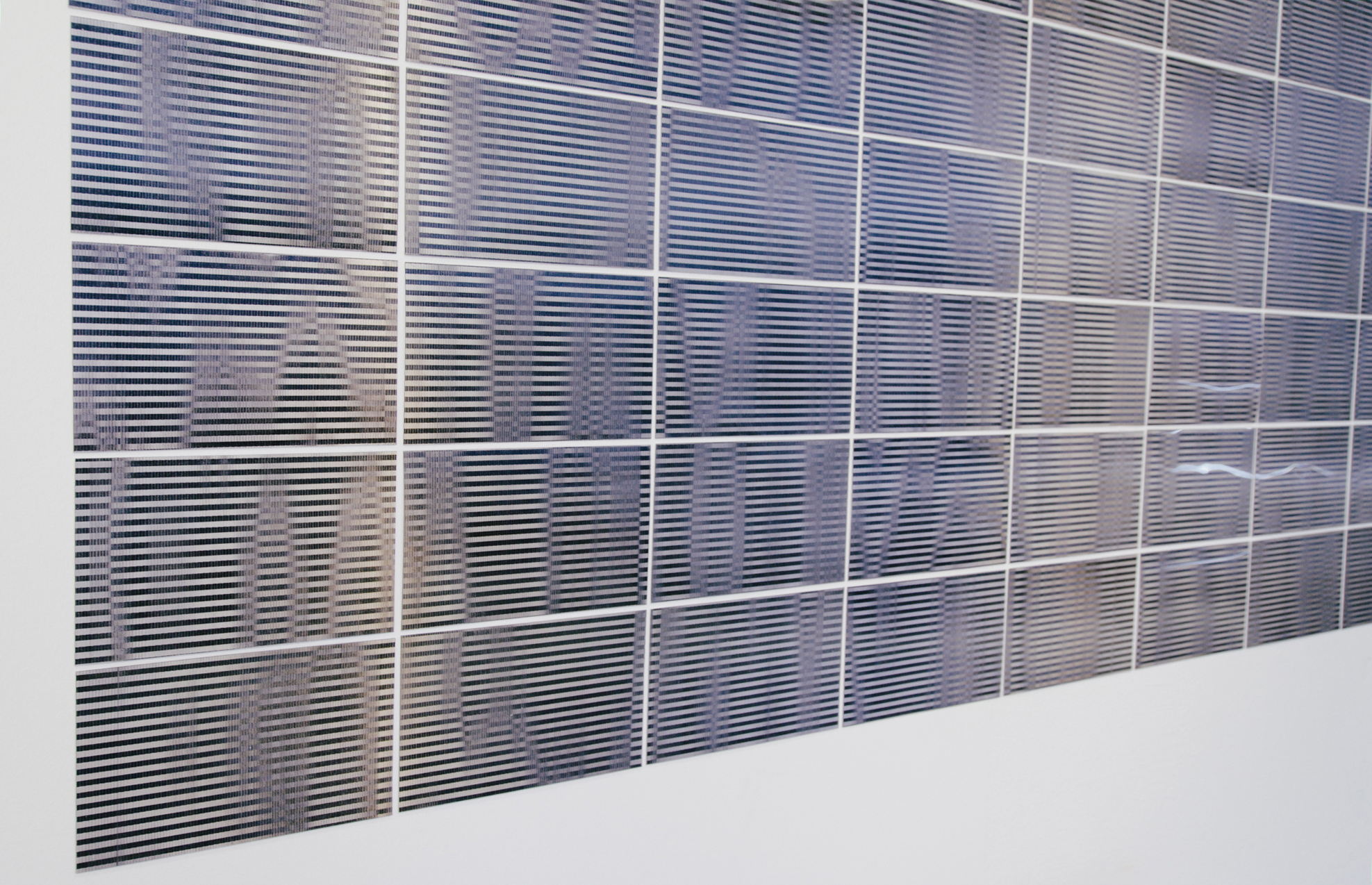 Durch eine gezielte Unregelmäßigkeit in der händischen Weiterverarbeitung maschinell gefertigter Komponenten wie Folien und Drucke entstehen optische Schlieren, Graubereiche und organische Muster, während die einzelnen Bilder vom Positiv ins Negativ kippen. Trotz der reduzierten Drucke aus schwarzen und weißen Streifen ergibt sich, abhängig von Körpergröße und Position der Betrachter*innen, ein individuelles Bild.